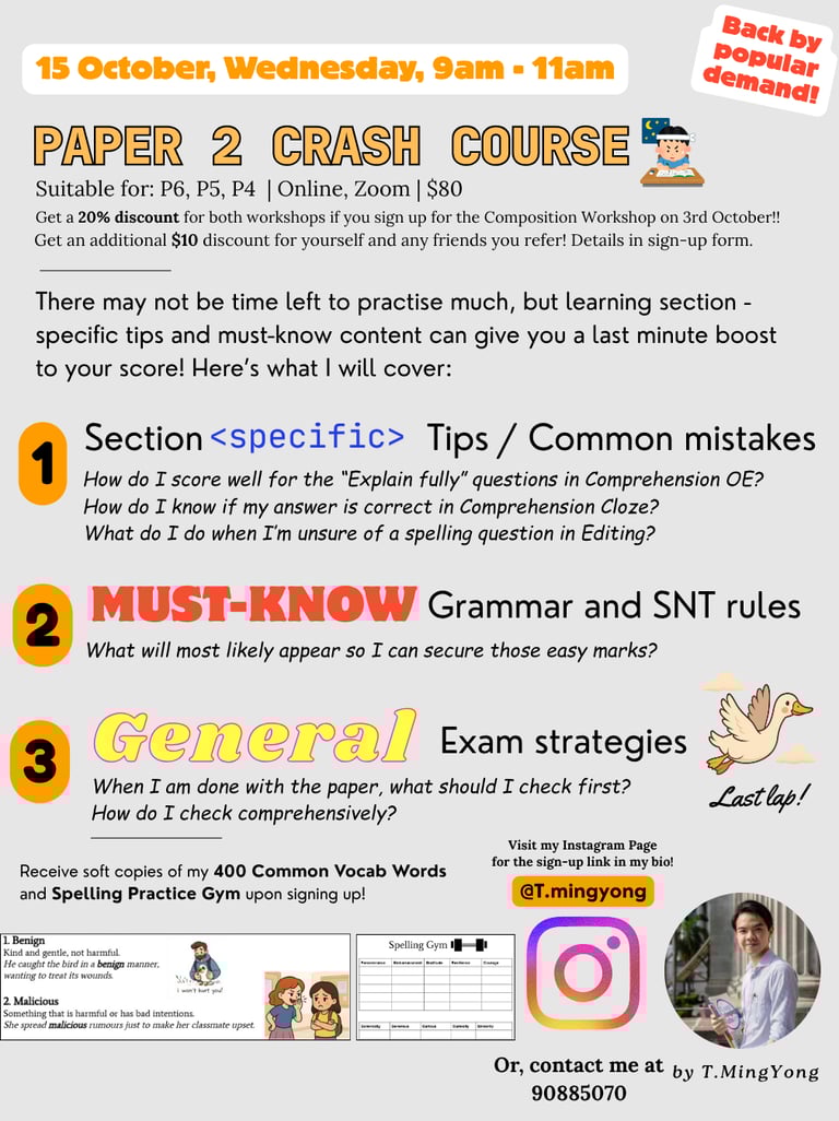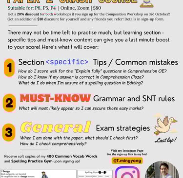 Dear all, my schedule is unfortunately full at the moment and I will not be able to take on additional students right now. However, if you'd like to discuss the possibility of me teaching your child in the future, or to ask about exam tips, please feel free to contact me! -T.MingYong